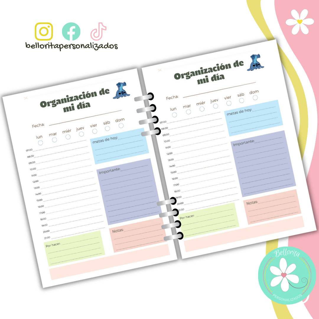 - Plan diario «Organización de mi día» con horas, metas de hoy, importante, notas y por hacer